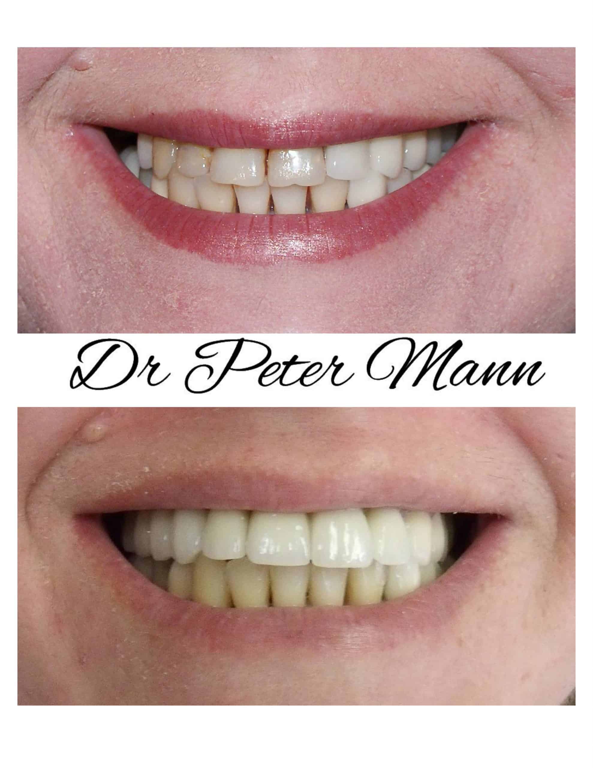41 year old male patient had neglected his teeth for many years. Dr. Peter Mann worked on patients upper teeth first. The front teeth received porcelain crowns and implants were placed to replace missing posterior teeth.